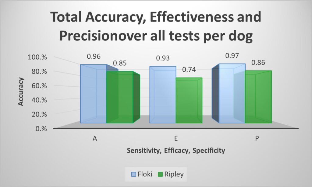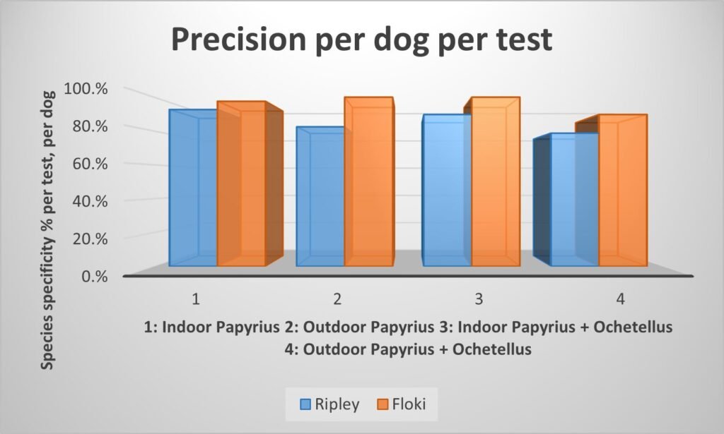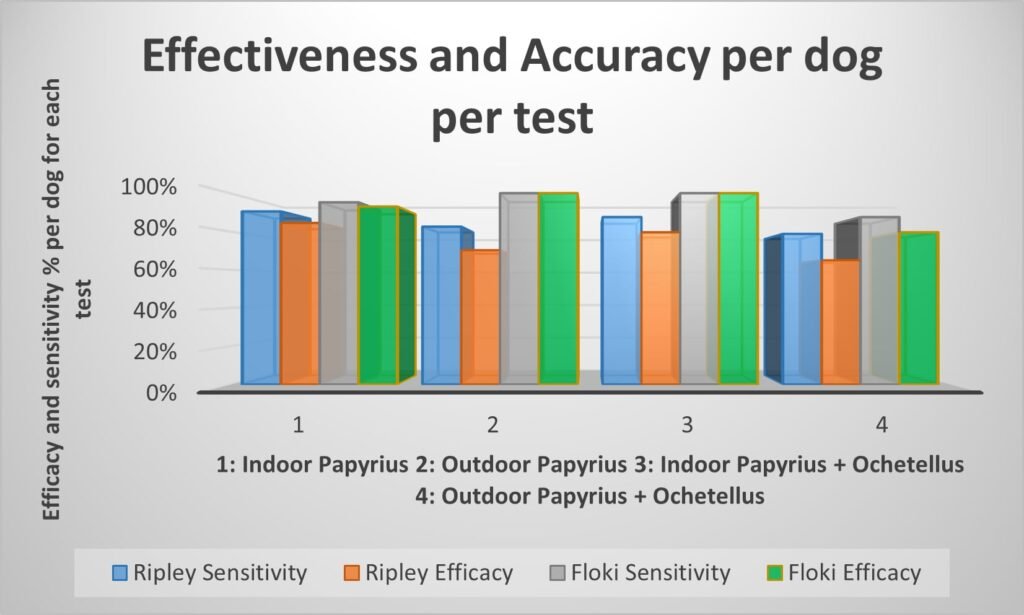Controlled test environments produced positive results in high numbers, with Floki offering 96.9% correct indications, very low distraction rate of 2 out of a total 161 tests, while Ripley offered 85.6% correct indications, with a higher distraction result of 15 out a total 167 test runs. These results indicate that training dogs to search and indicate on a focus odour is highly achievable. Success in the field however depends on many criteria such as the dogs drive levels, temperament and interest in the work.
