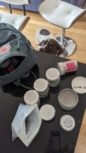 Using a double-blind technique, where research assistants set the focus odour locations into a numbered randomised hole in the test board each test run, using gloves and cleaning surfaces between each run. The dog was called through, asked to examine the cannister and then asked to “Find” the target odour. An indication is logged when the dog sits and points its nose at the target it has found. The handler then approaches, examines the indicated item and click-and-rewards a correct indication. If the dog was incorrect, the handler asked the dog to “Find “ again and the same procedure followed. Once a target had been identified, the dog and handler left the test environment and waited out of sight to be recalled by the research assistant for the next test run after